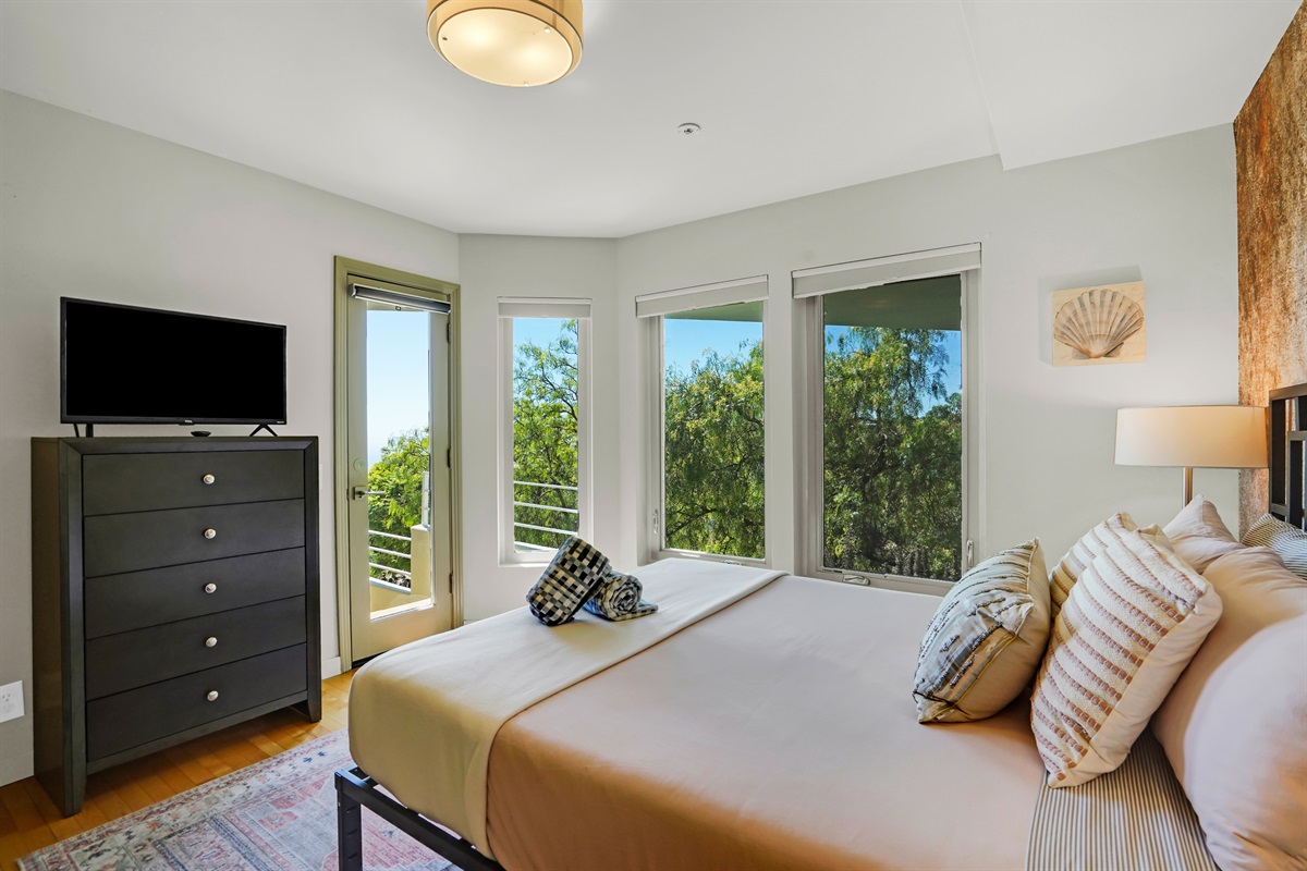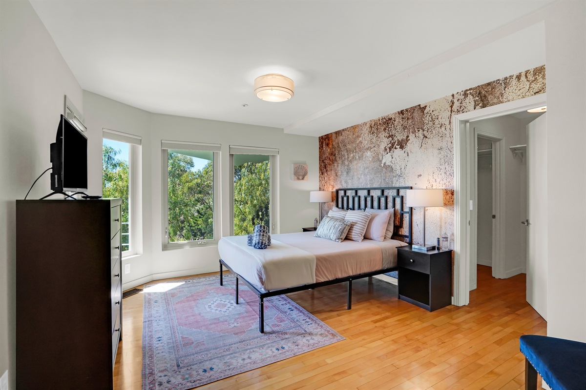 King Bedroom: Walk-in closet, ensuite bathroom with soaking tub, and private balcony.