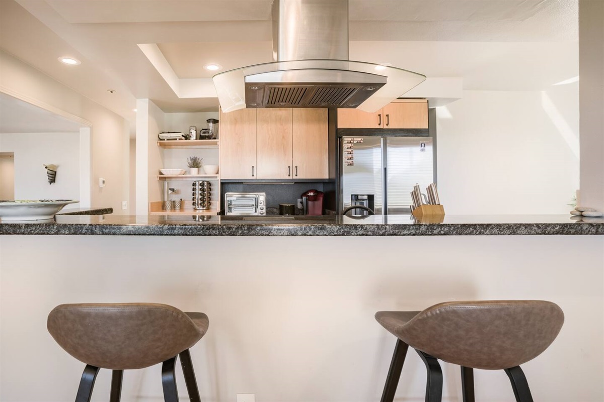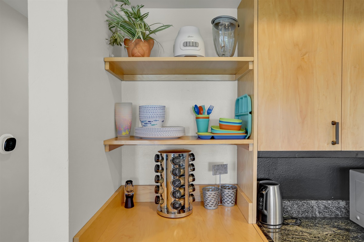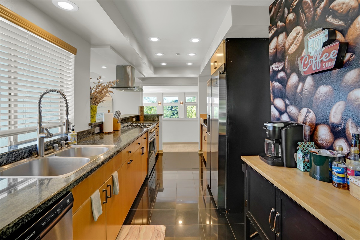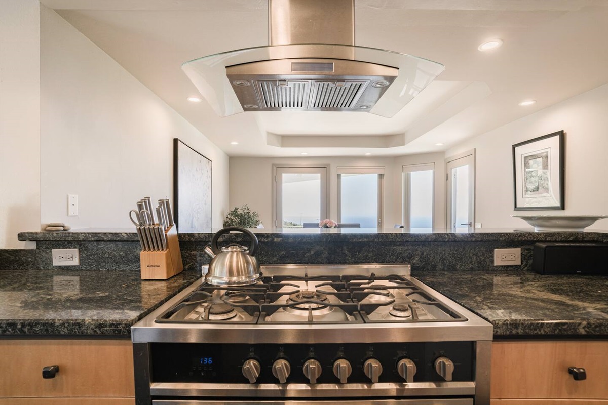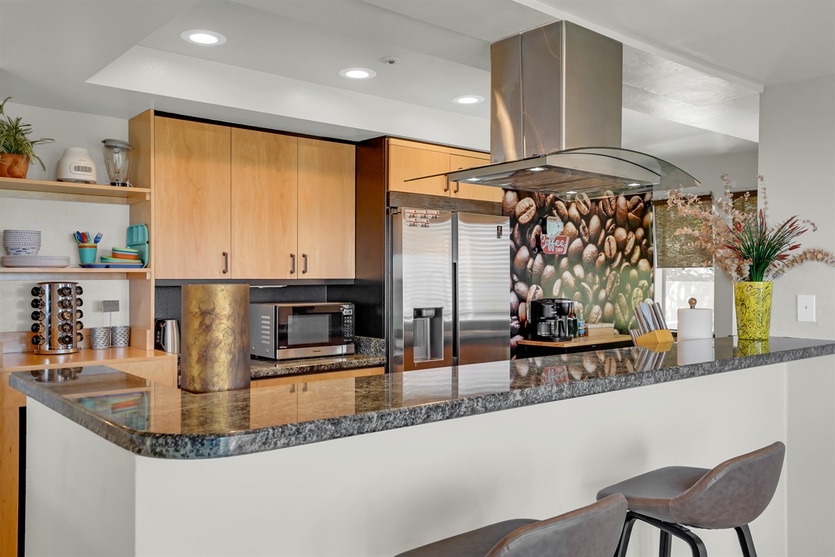 Cook and dine in style in the fully loaded kitchen with a 36” gas range, stainless steel appliances, and essentials like spices, olive oil, and coffee pods.