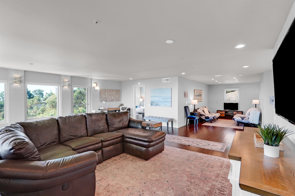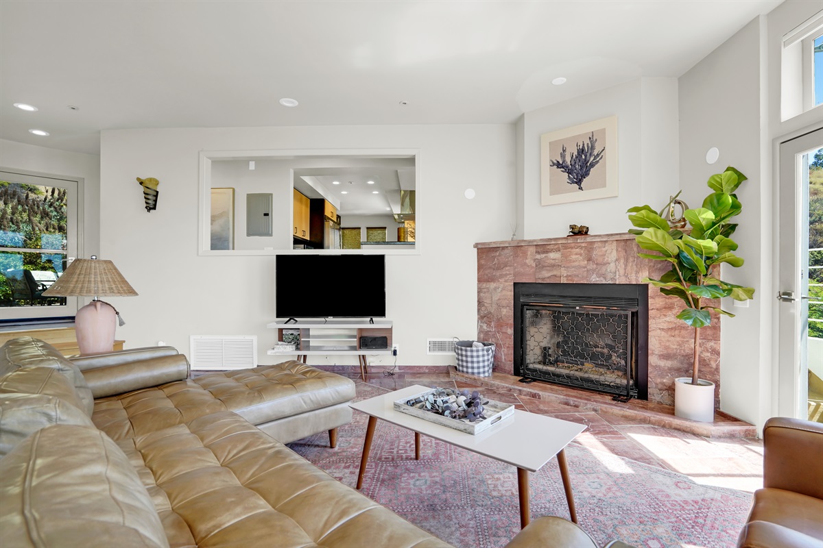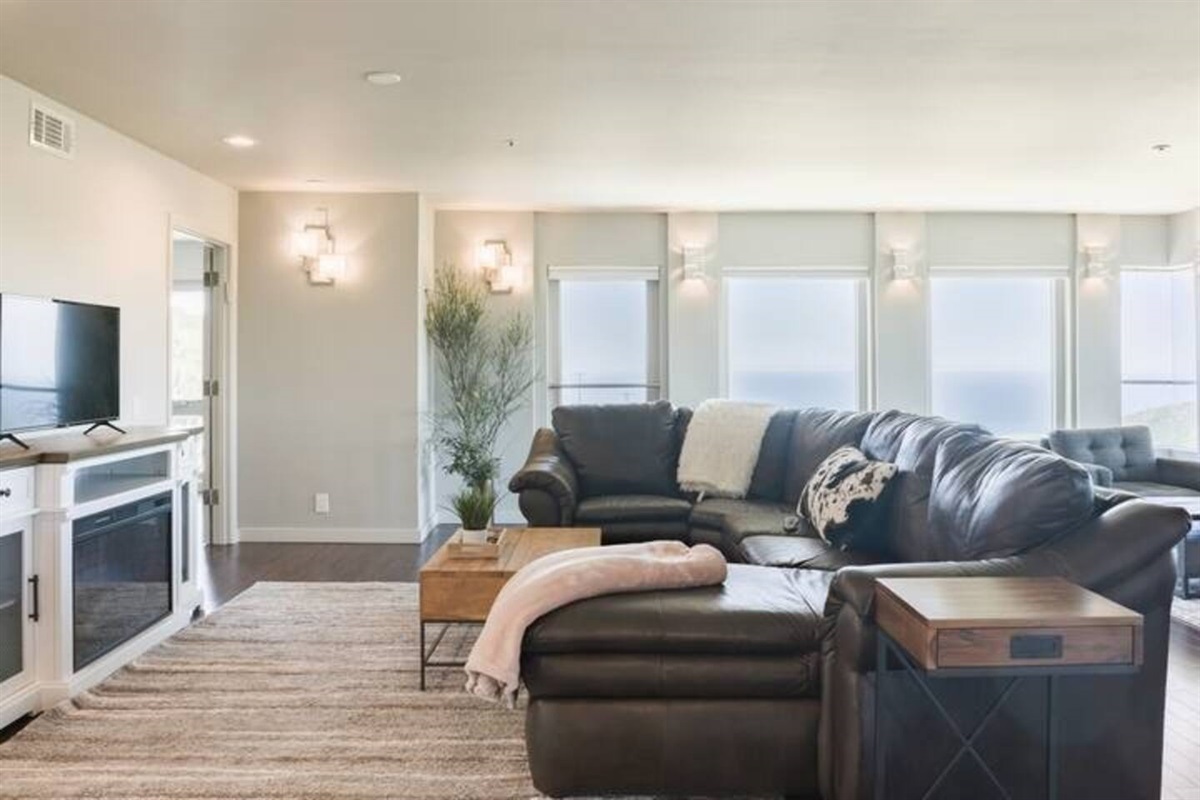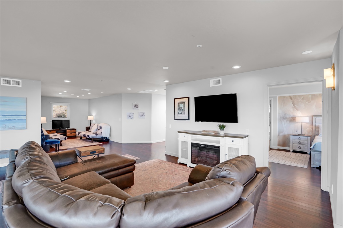 Living room with leather couches, gas fire place and large 60" Smart TV