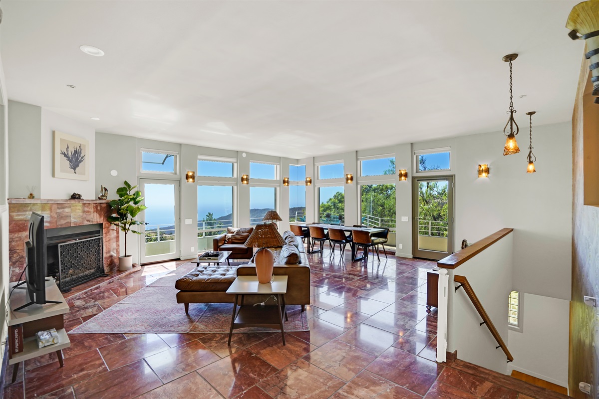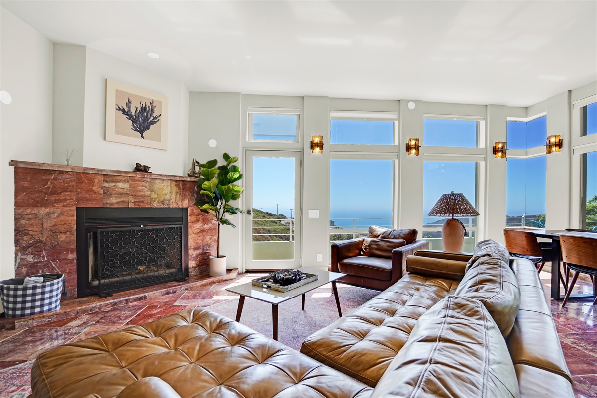 Main Living Room: Featuring pink marble floors, 18’ ceilings, a gas fireplace, and floor-to-ceiling windows for endless ocean views. Step onto the wrap-around balcony to enjoy stunning sunsets or relax in the evening breeze.