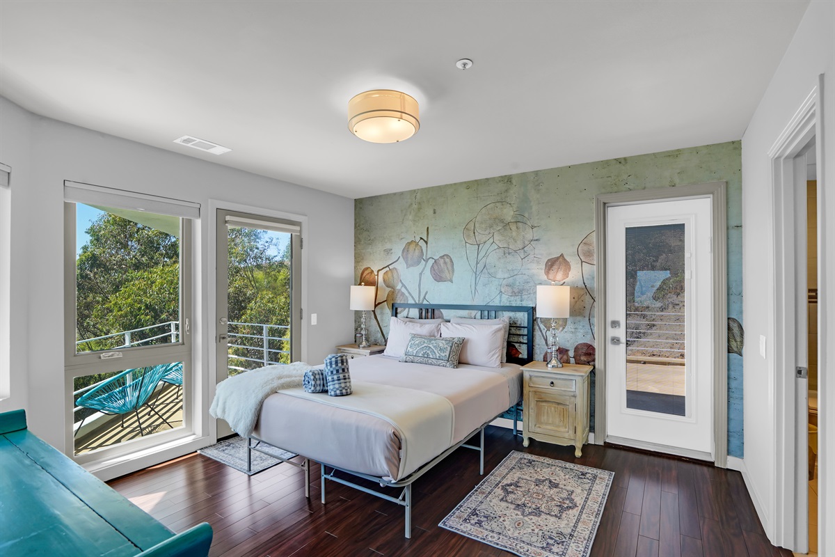 Queen Bedroom: shared jack/Jill bathroom with other Queen bedroom, balcony and deck patio