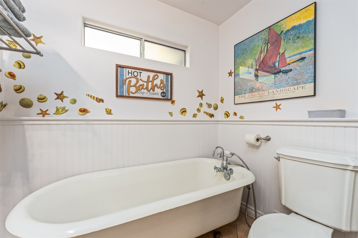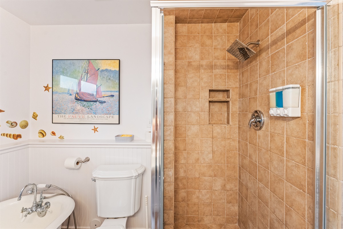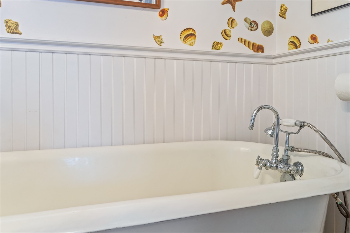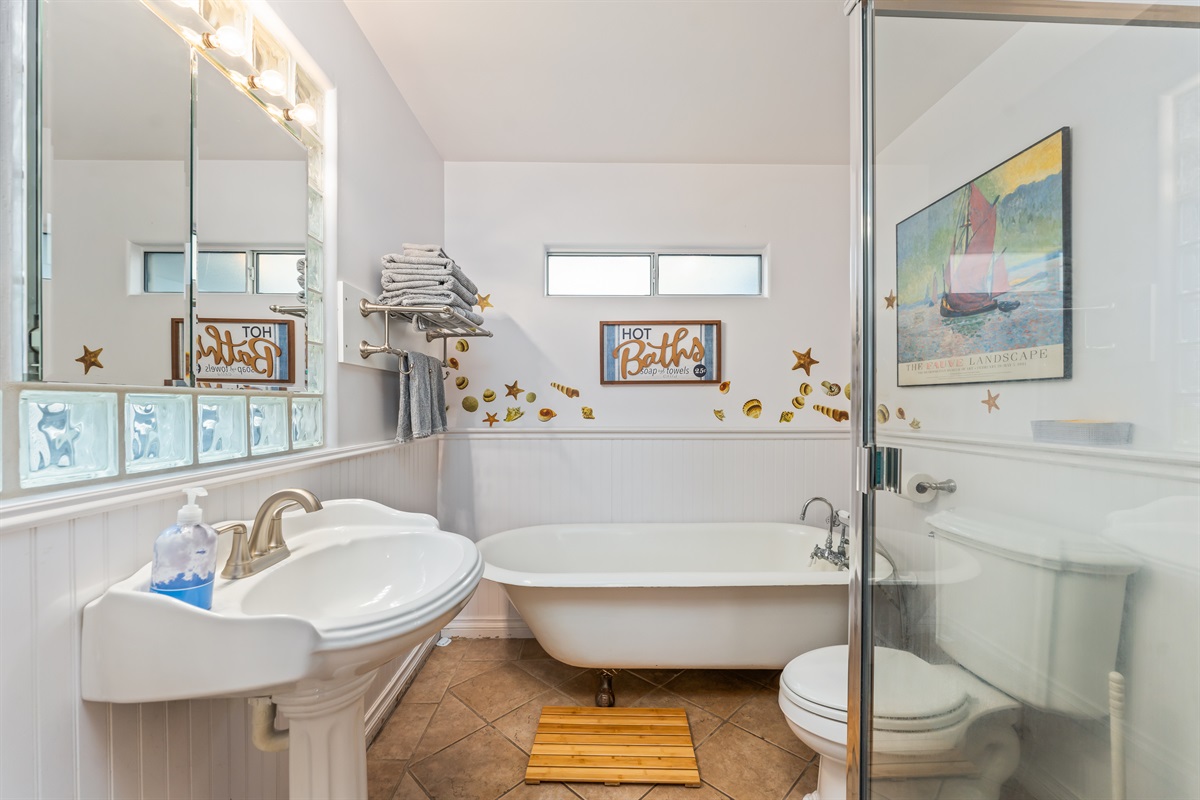 The primary bedroom has a private bathroom with a classic pedestal tub and a walk-in shower.