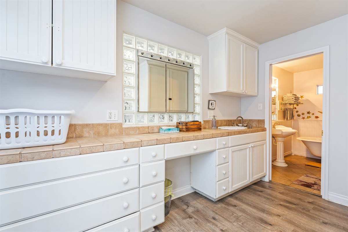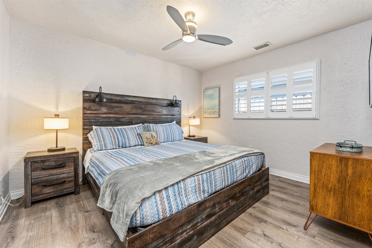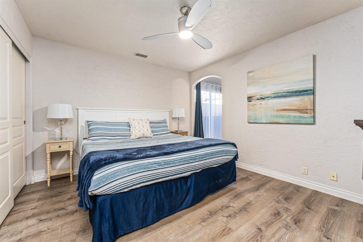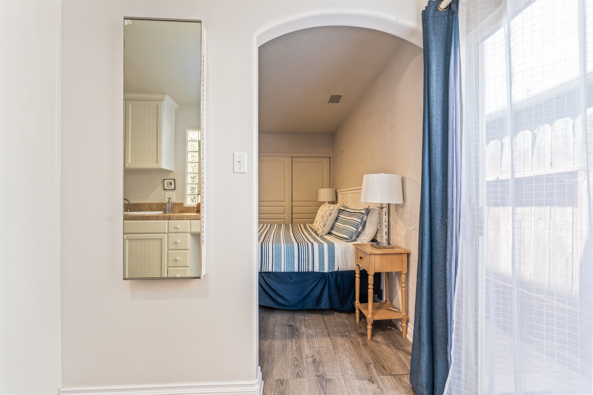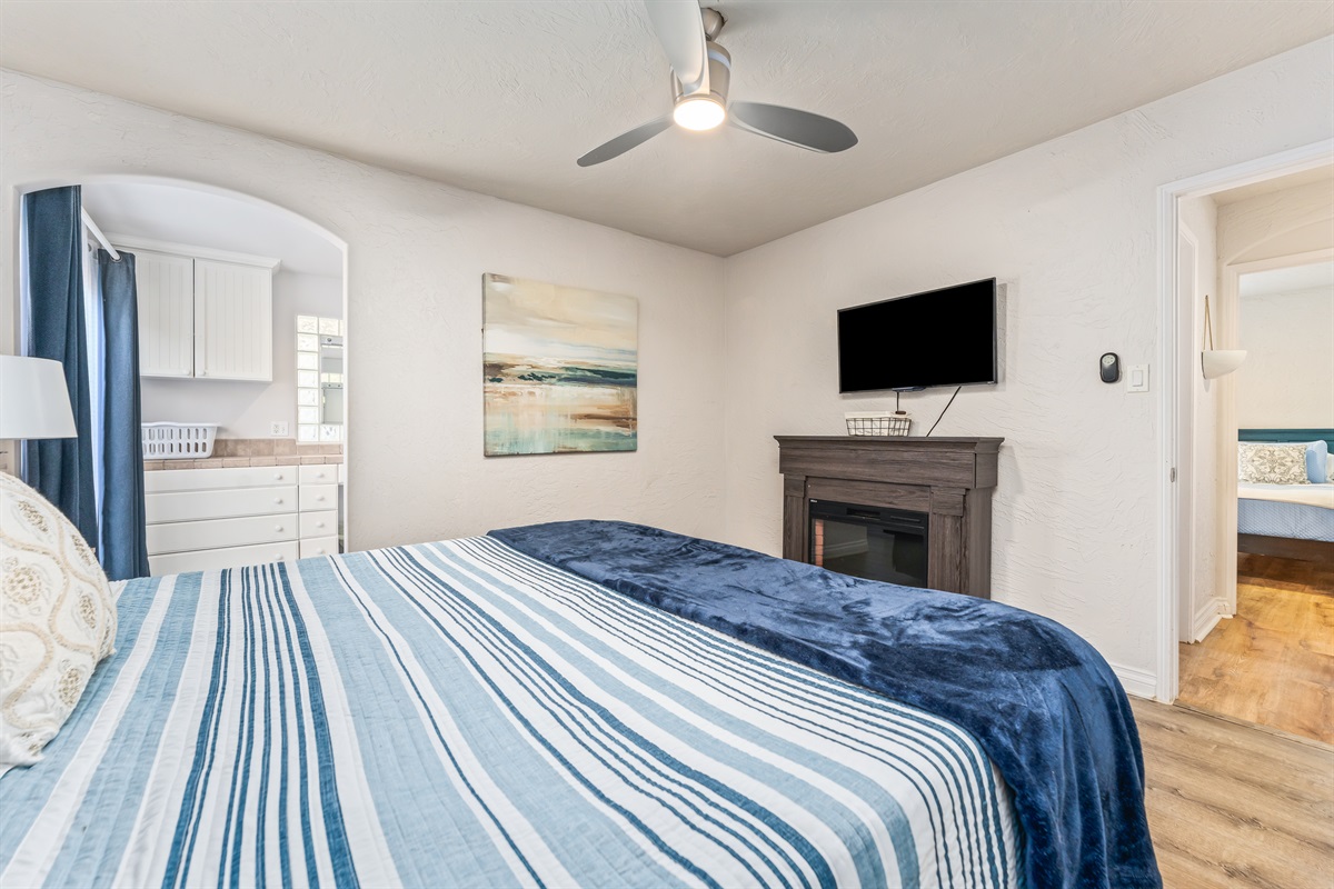 BEDROOM 1: has a King bed with Hybrid mattress, 1 lamo with USB charger, and a large closet wtih sliding doors plus a 39" TV. You will also enjoy a unique dressing area that leads to a large ensuite bathroom as well as sliding doors that lead to the back patio.The Ensuite Bathroom has a Claw-foot style bathtub and a walk-in separate shower. Shampoo, conditioner and shower gel are provided. There is also a hair dryer in the dressing area.