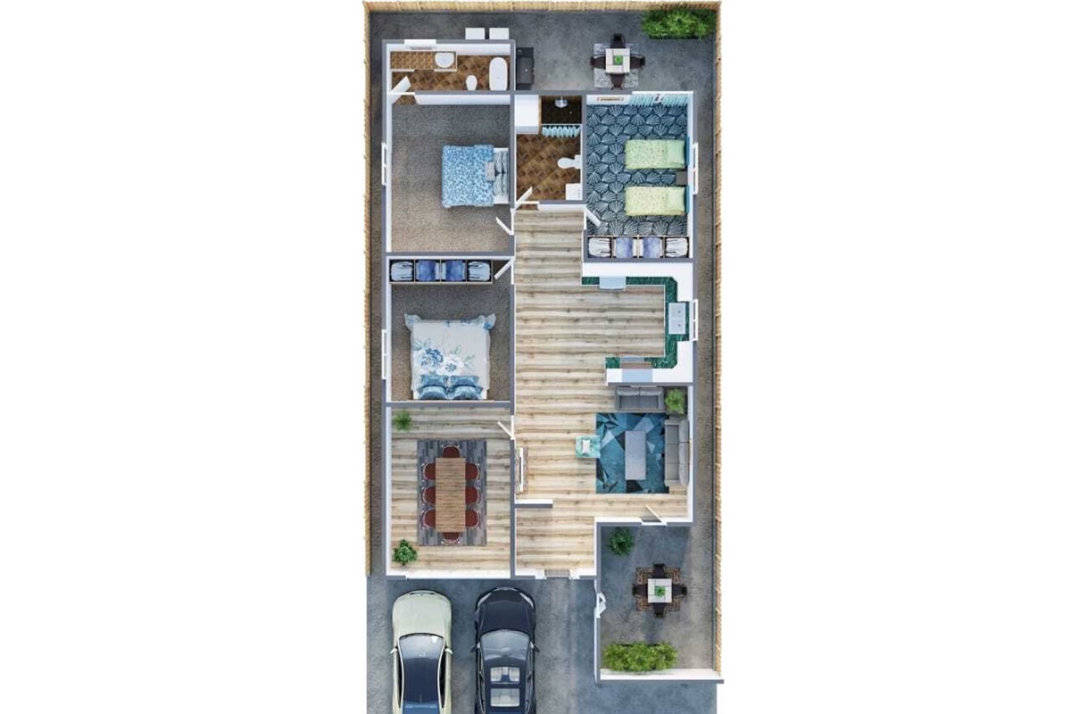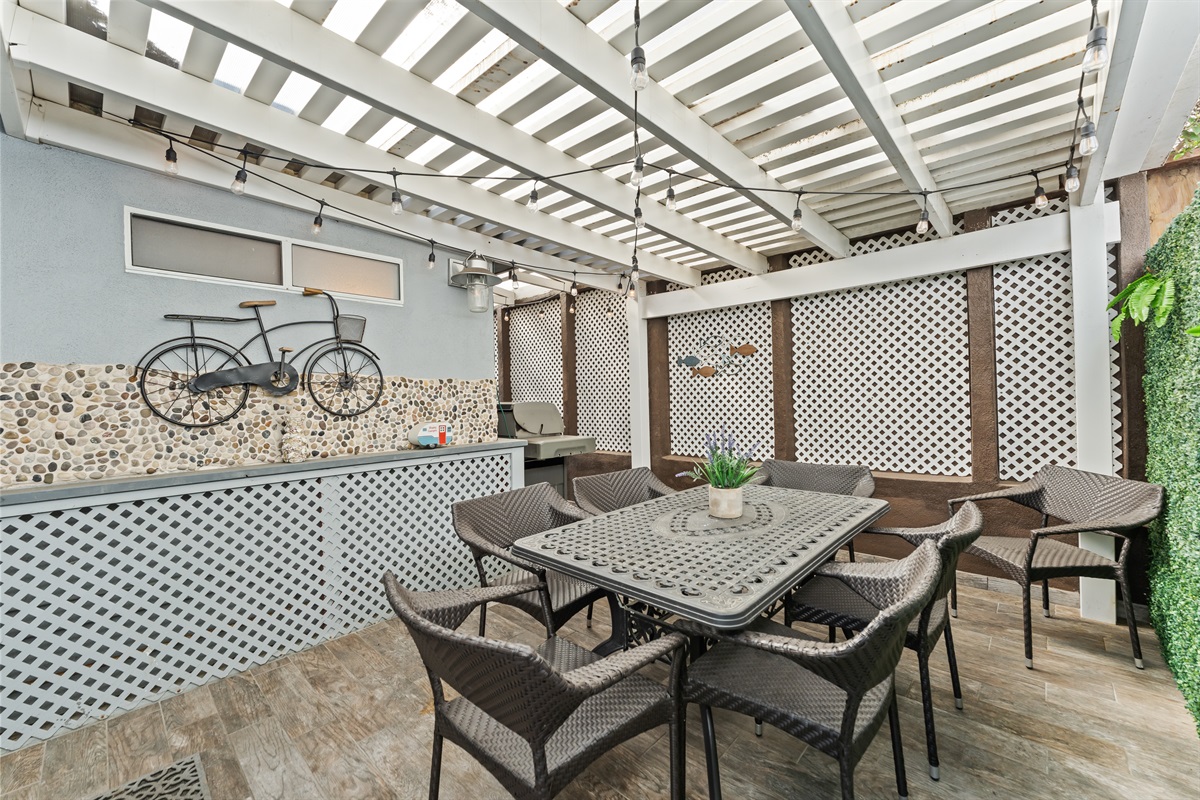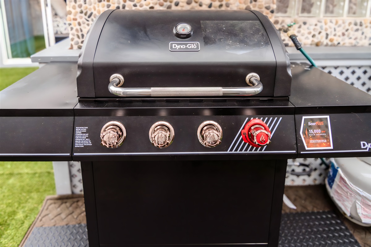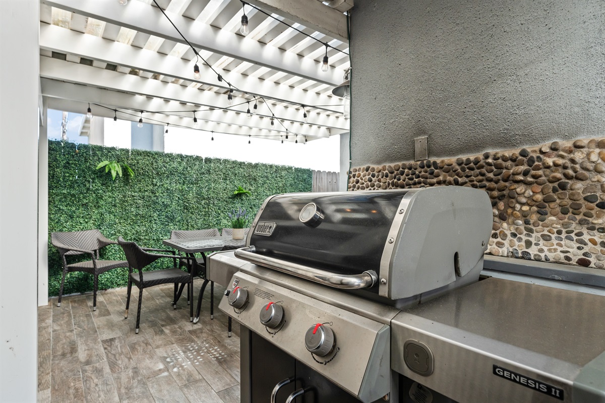 A second patio at the back of the home offers more outdoor hangout spaces, including faux grass, outdoor lounge furniture, and a gas grill.