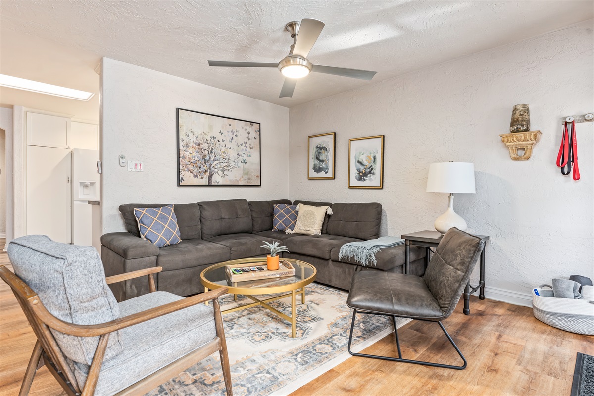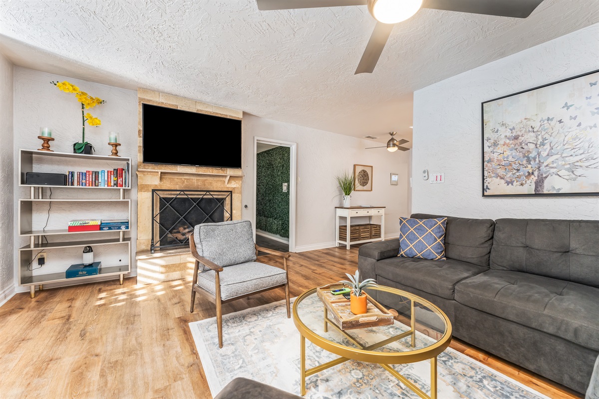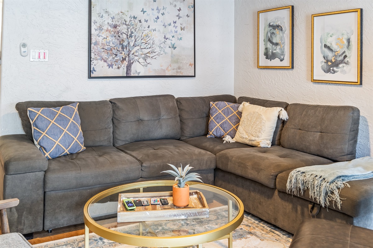 The living area offers plenty of room to relax, with high-end sofas and a 58 inchRoku TV for family movie nights.