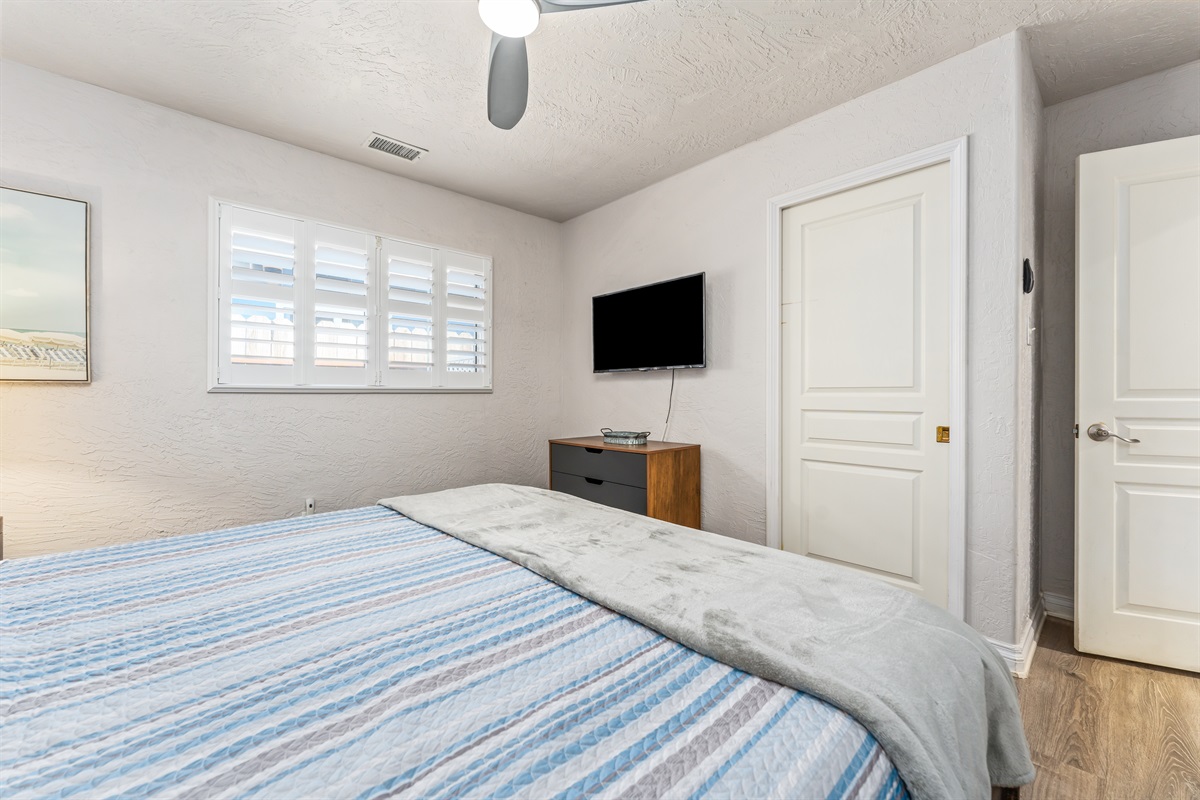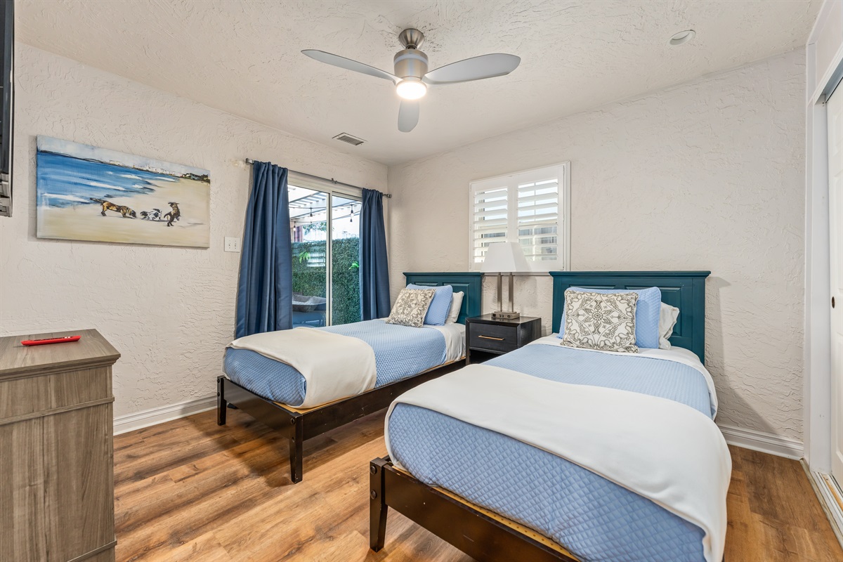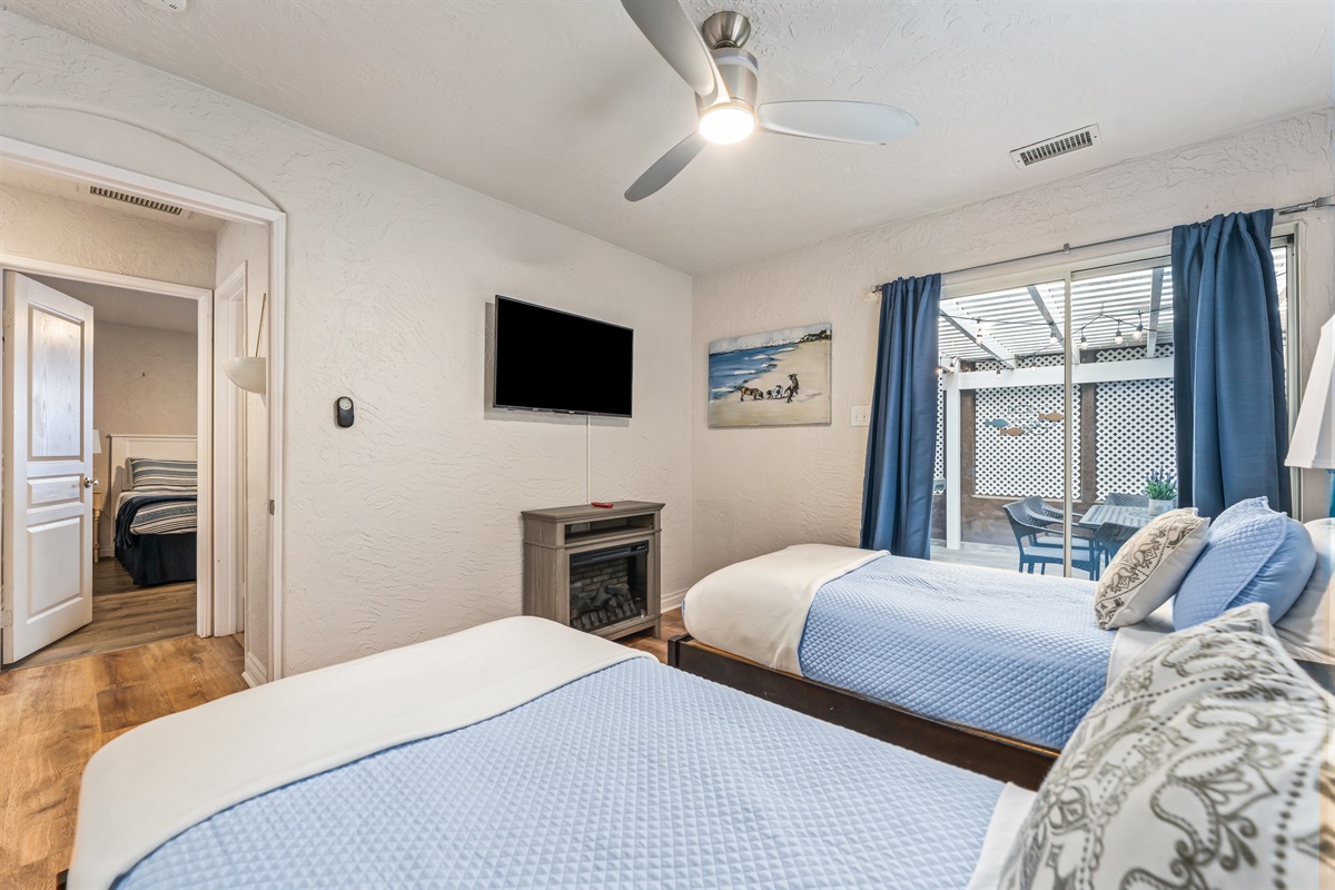 BEDROOM 3: Two twin-size beds, a large closet and a 49" Smart TV. It also has a sliding door to the rear patio.