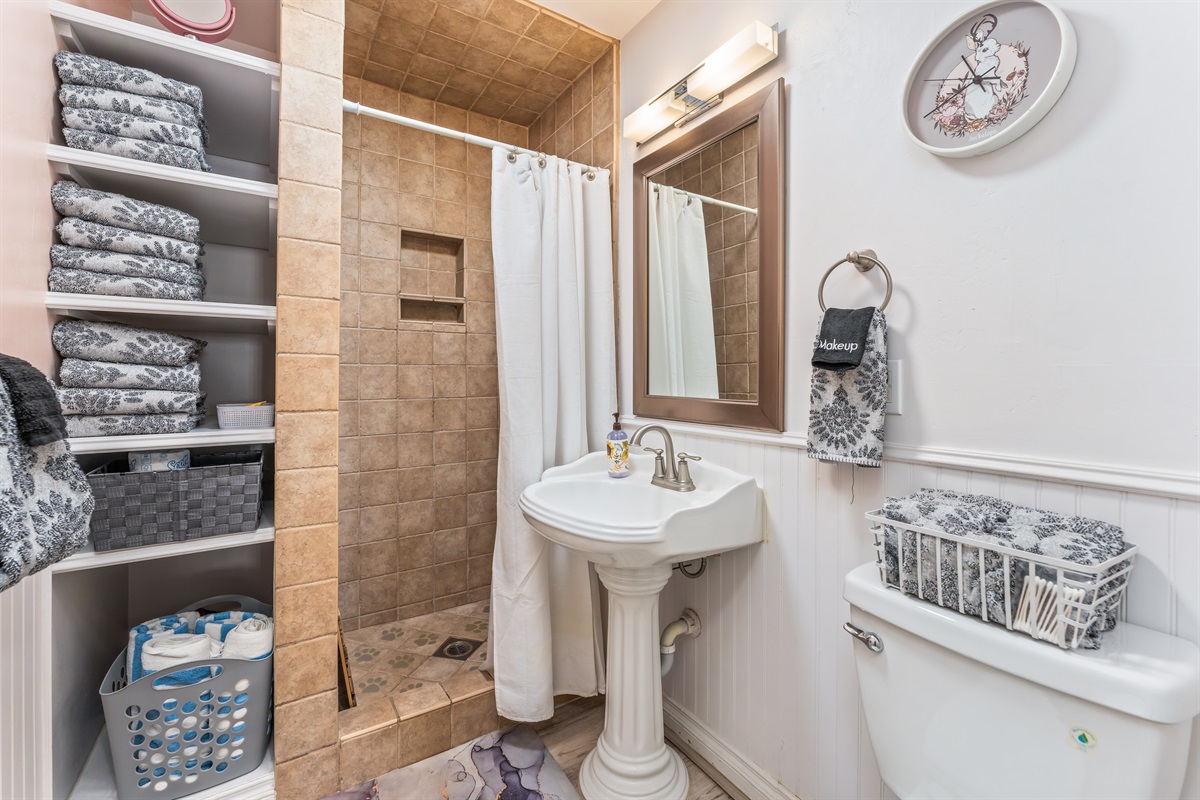 The second bathroom, conveniently located, boasts a tiled walk-in shower and built-in storage for your belongings. Both bathrooms are stocked with hotel-quality towels and bathroom basics for your comfort including shampoo, conditioner and shower gel.