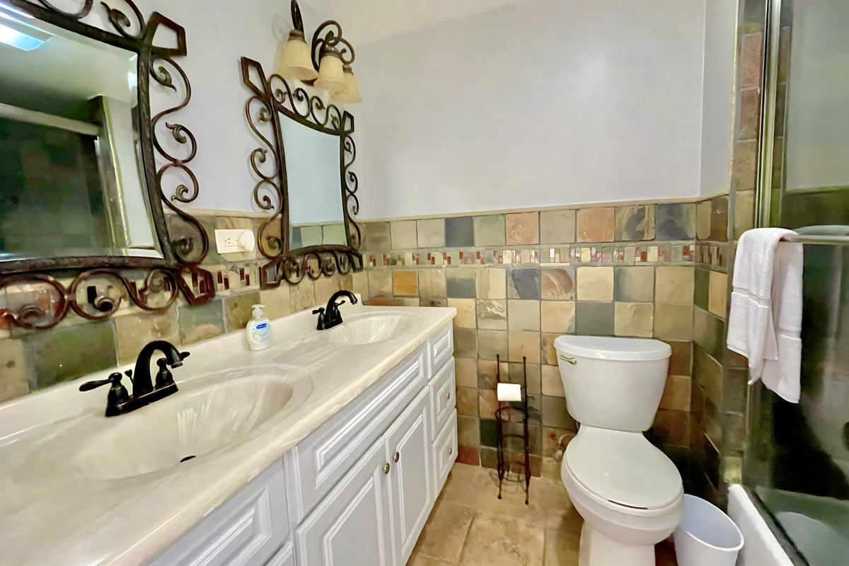The ensuite bathroom is in the master and has a full shower/tub combination , double sink and toilet.