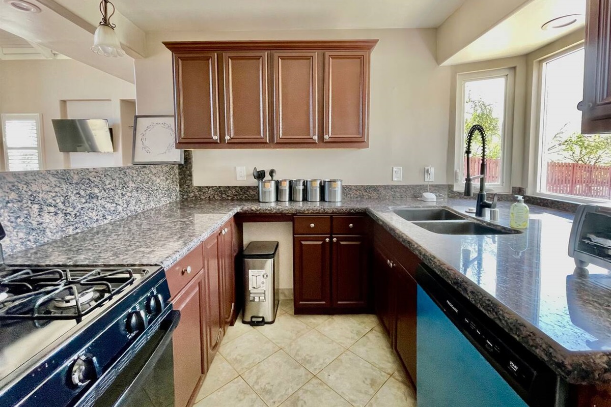 The kitchen has a door to the driveway for easy entry for groceries or if you don't feel like walking around to the front of the house. It is small but has a full range (2022 model), dishwasher (2023), and full refrigerator (2021). We have tried to include as much cookware and appliances as we could and if you have a special request, let us know!