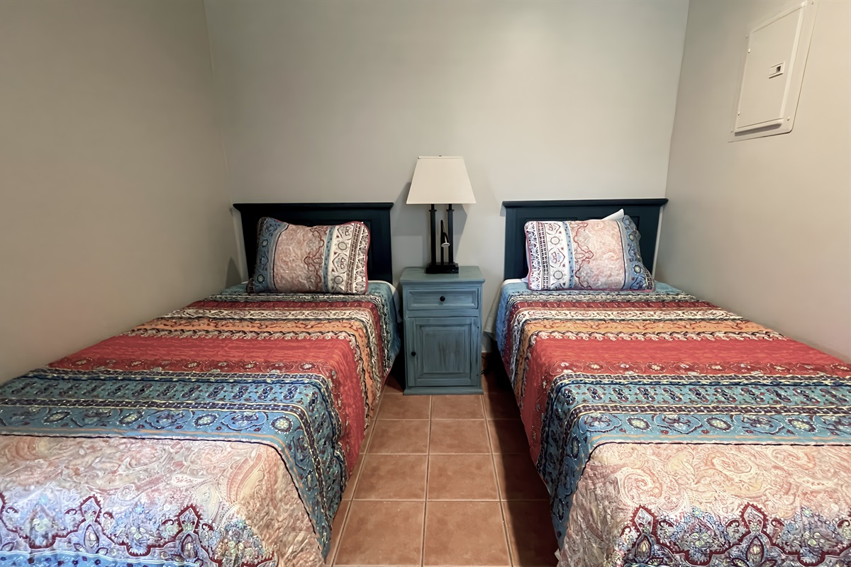 The twin bedroom is between he living room and master bedroom. Two twin beds and a Smart TV. There are doors to close the bedrooms off for privacy but you do need to walk through the twin to get to the master unless you walk outside.