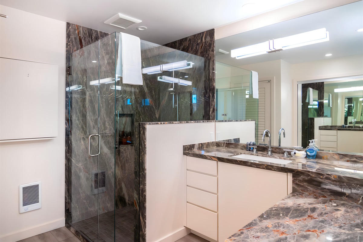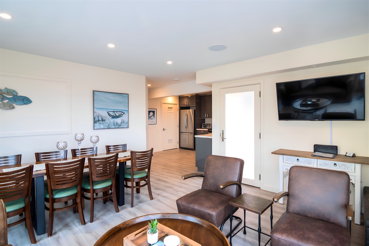 Step into a bright, open-concept living and dining area where floor-to-ceiling glass frames the ocean just outside. Whether you’re sipping coffee on the patio, cooking together in the kitchen, or winding down by the fireplace, everything here is designed for comfort and connection.