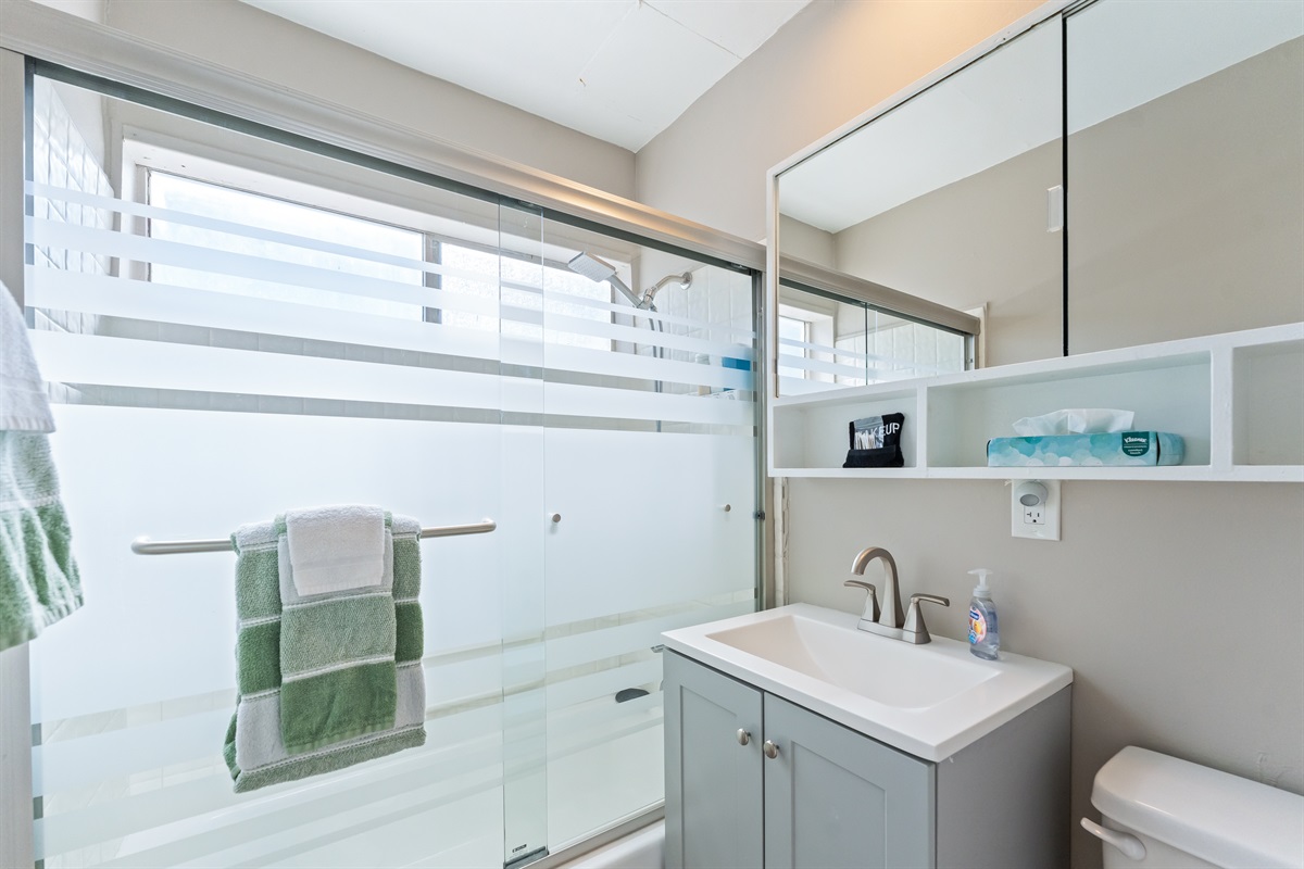 Bathroom stocked with fresh towels and essential bath amenities